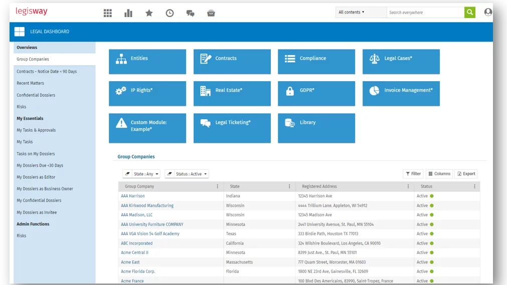 - Entity & Corporate Governance: Centralize management of legal entities and corporate records. Generate organizational charts with a single click and use a dynamic map to oversee global company registrations and licenses.