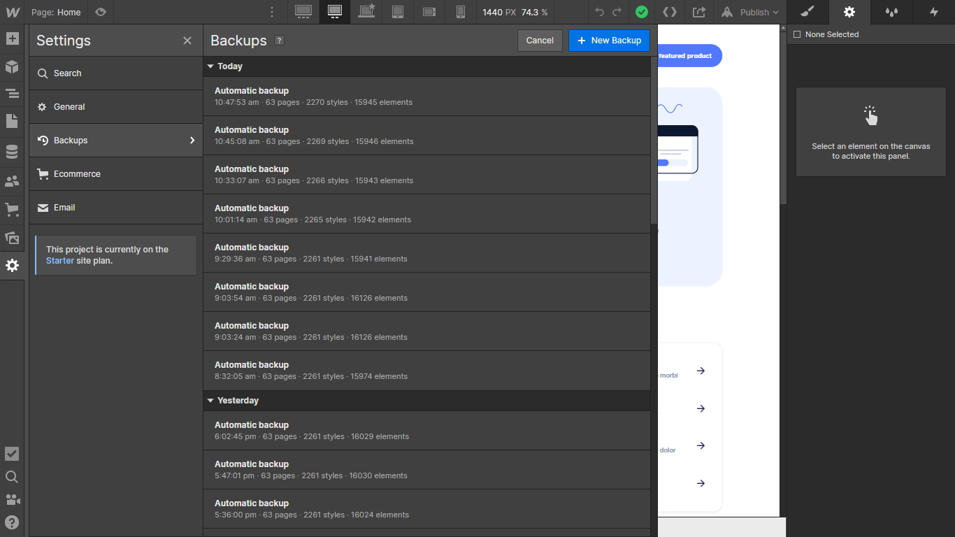 If something goes wrong, for example, if you are not liking where the website is going to, if you deleted some critical classes that were required to make the Template look nice, or if you just want to go to a previous version for any reason, you can always go to the Backups section.